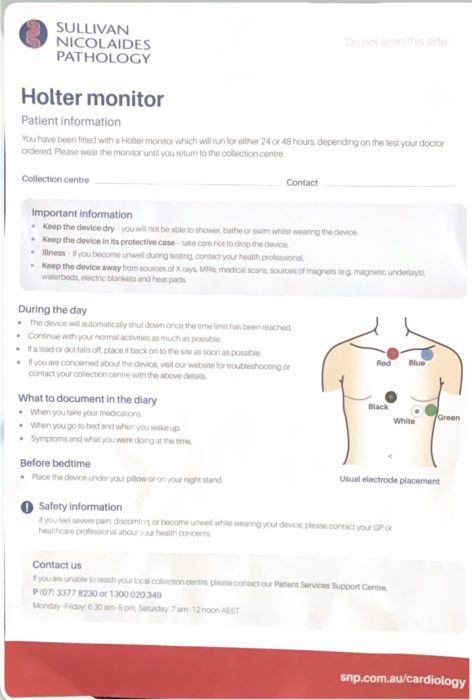 というわけでHoltor monitor, 24 hourという名の心電図検査は、SULLIVAN NICOLAIDES PATHOLOGYで受けることに。