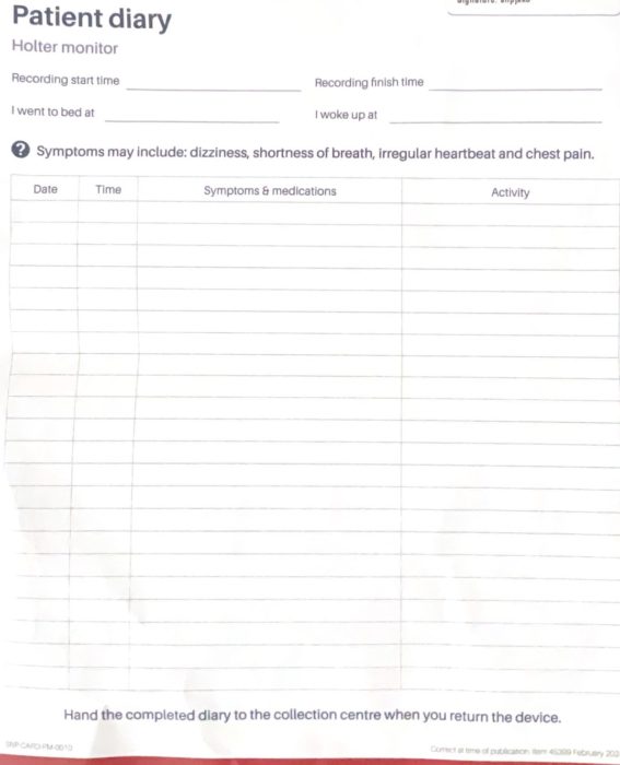 24時間の間になにか異常を感じたりしたら、このPatient diaryに記録しておいてね!とも言われました。体調崩すのは嫌だけど、英語の勉強になりますね。