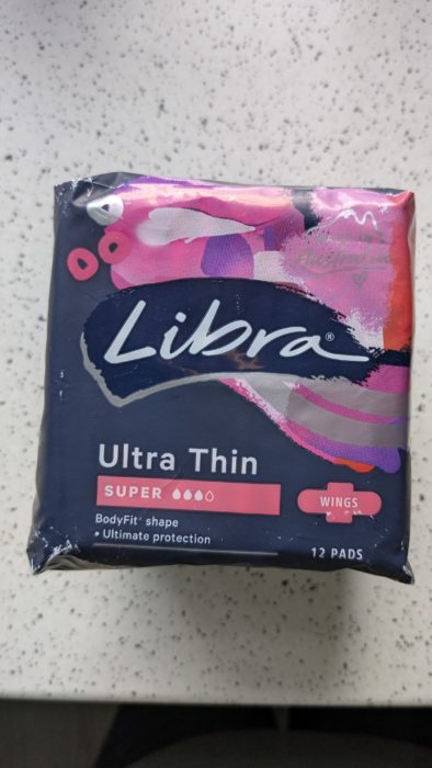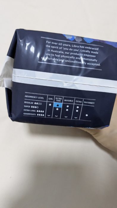 今回買ったのはおそらく昼用で、極薄タイプのものです。オーストラリアで普通のナプキンを買うとなかなかのゴワゴワ感だったので、Ultra-thinとかSuper-thinと書かれているものを買うようになりました。