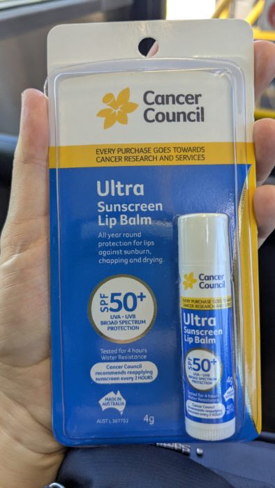 オーストラリアのCancer Councilから出ているこのリップバームです。通常は7〜8ドルらしいけど、私はセール時におよそ半額の価格で買いました。