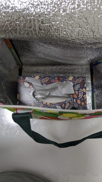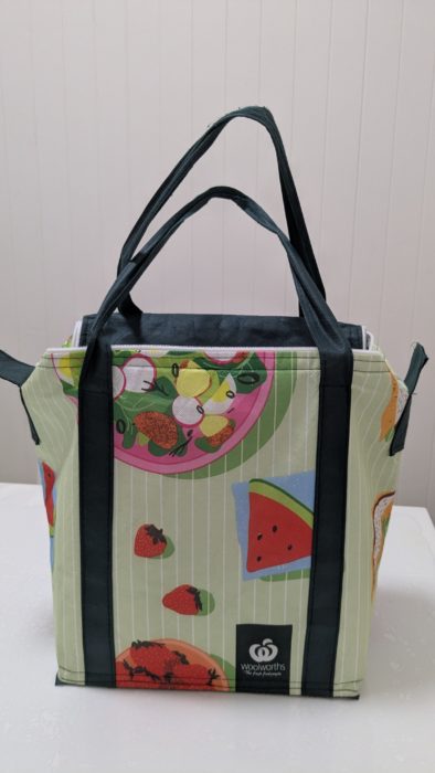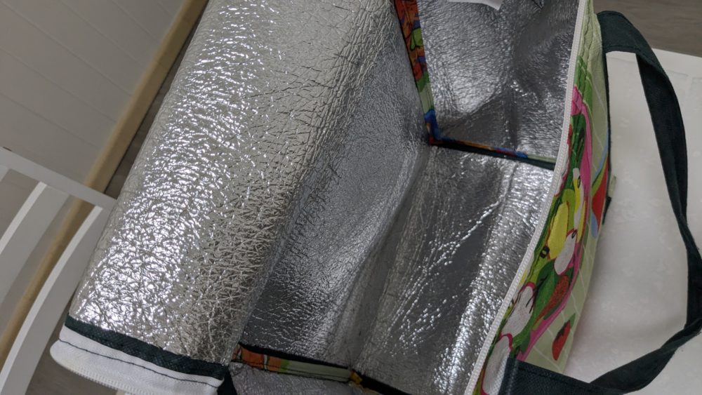 この中に保冷剤を入れて使います。どれくらい保冷効果があるかは不明ですが、ブリスベンは高湿度で暑い夏が続くため保冷バッグは必須です。