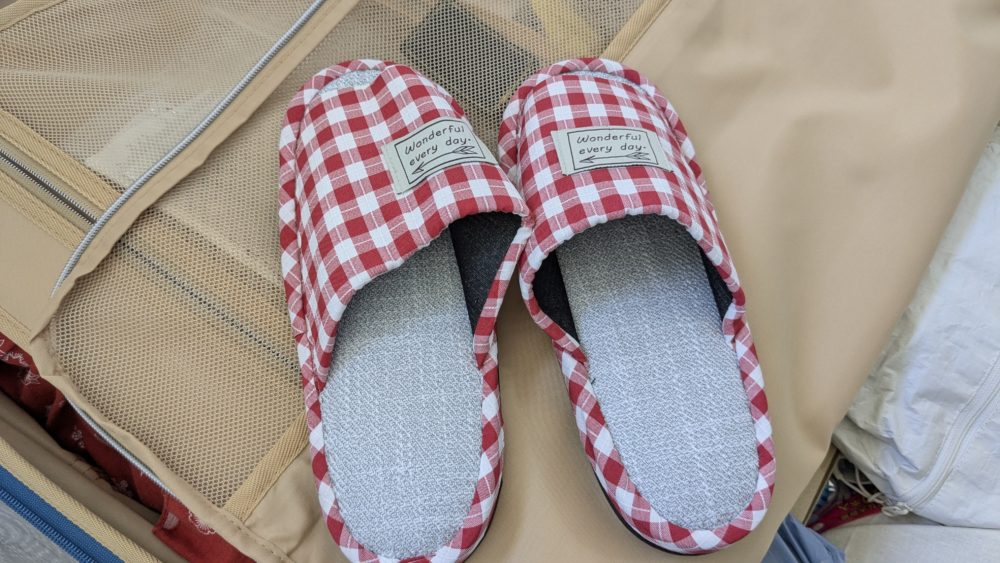 ドラッグストアで600円くらいで買ったいたって普通のスリッパです。現地に着いた当日から家で履くスリッパが必要だったので入れておきました。