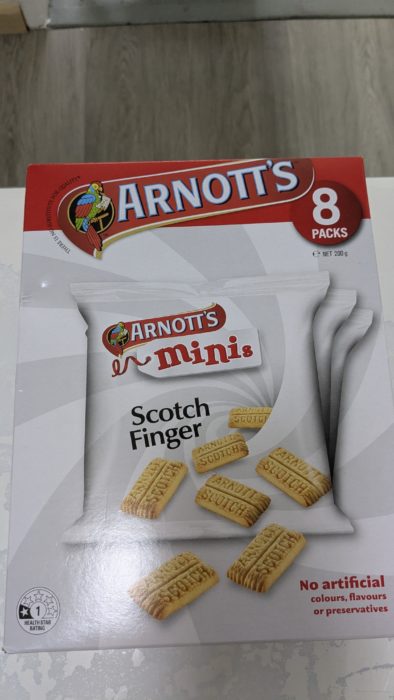 Arnotts Mini Scotchは個包装8袋入りのクッキーみたいなお菓子です。夫は結構気に入ったみたいです。