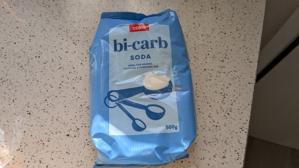 Bi carbonate sodaはベーキングソーダ(重曹)です。ステンレス鍋のコゲ落としのために買いました。オーストラリアでは食用の重曹しかないみたいで、これもそうです。