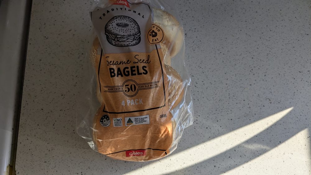 毎週頼んでいた食パンに少し飽きてきたのでベーグルを買ってみました。Colesブランドで安いほうなのに、原材料がシンプルで安心して食べられました。