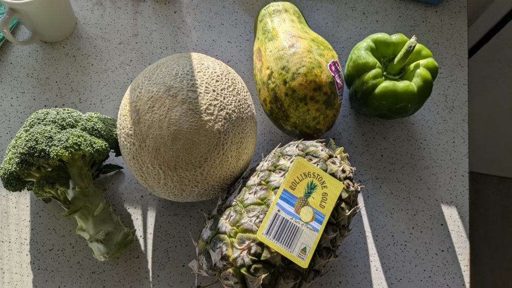 どの野菜も高くて買う気になれず今回はこれだけです。ブロッコリーは良心的、ピーマンはこちらではパプリカのような大きさなのでこれも納得。