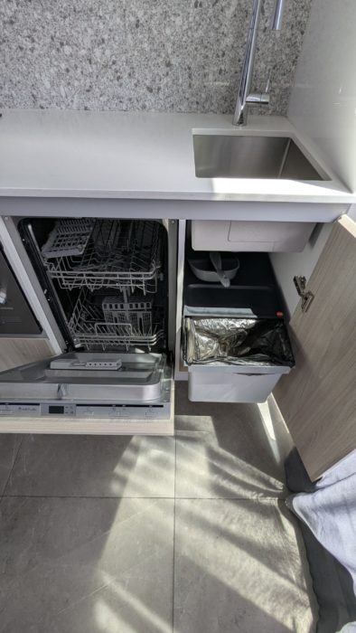 食洗機もあります。食洗機の隣はなぜかごみ箱があります。ゴミ箱、なぜここに?隠す収納でしょうか。