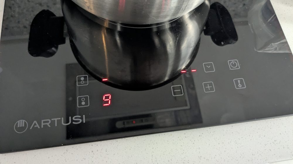 左の上下丸ふたつのマークは、上のコンロか下のコンロ、という意味です。どちらを使うか選択して、あとはプラスマイナスで熱レベルを決めます。たしかこんな感じだったはず。